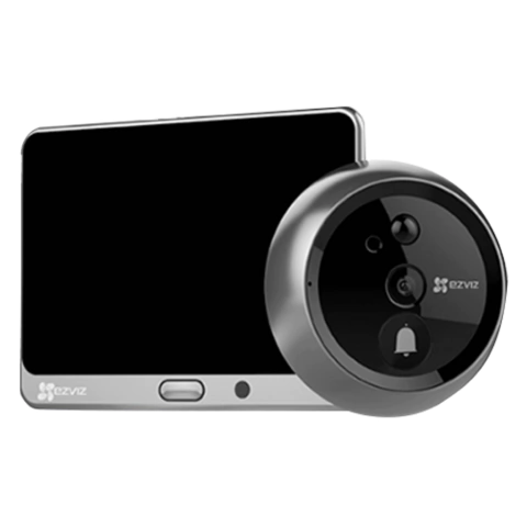 videoportero y mirilla WIFI. DP1C, CMOS de escaneo progresivo de 1/3 pulgadas, lente de 2,2 mm a f2.4, ángulo de visión: 104° (horizontal/vertical), 136° (diagonal), Resolución máx. 720p/1 MP, Detección por infrarrojo pasivo (PIR), Distancia 3 m como máximo, Ranura para tarjetas microSD de hasta 128 GB, ulsador del timbre, botón de encendido y botón de activación de la pantalla, Pantalla en color de 4,3 pulgadas, 5 VCC